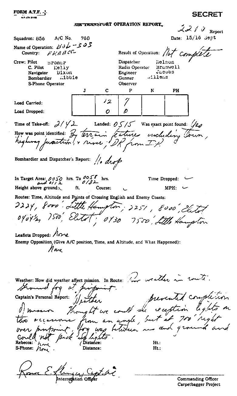 Following the temporary cessation of operations in mid-September of 1944 the crew moved to Cheddington to be with the Night Leaflet Squadron. Presley W. Smith, formerly of the lost Pratt crew, went with them. On the night of 4/5 January 1945, after suffering an engine loss, their plane was shot down by an English AA battery, but all survived.