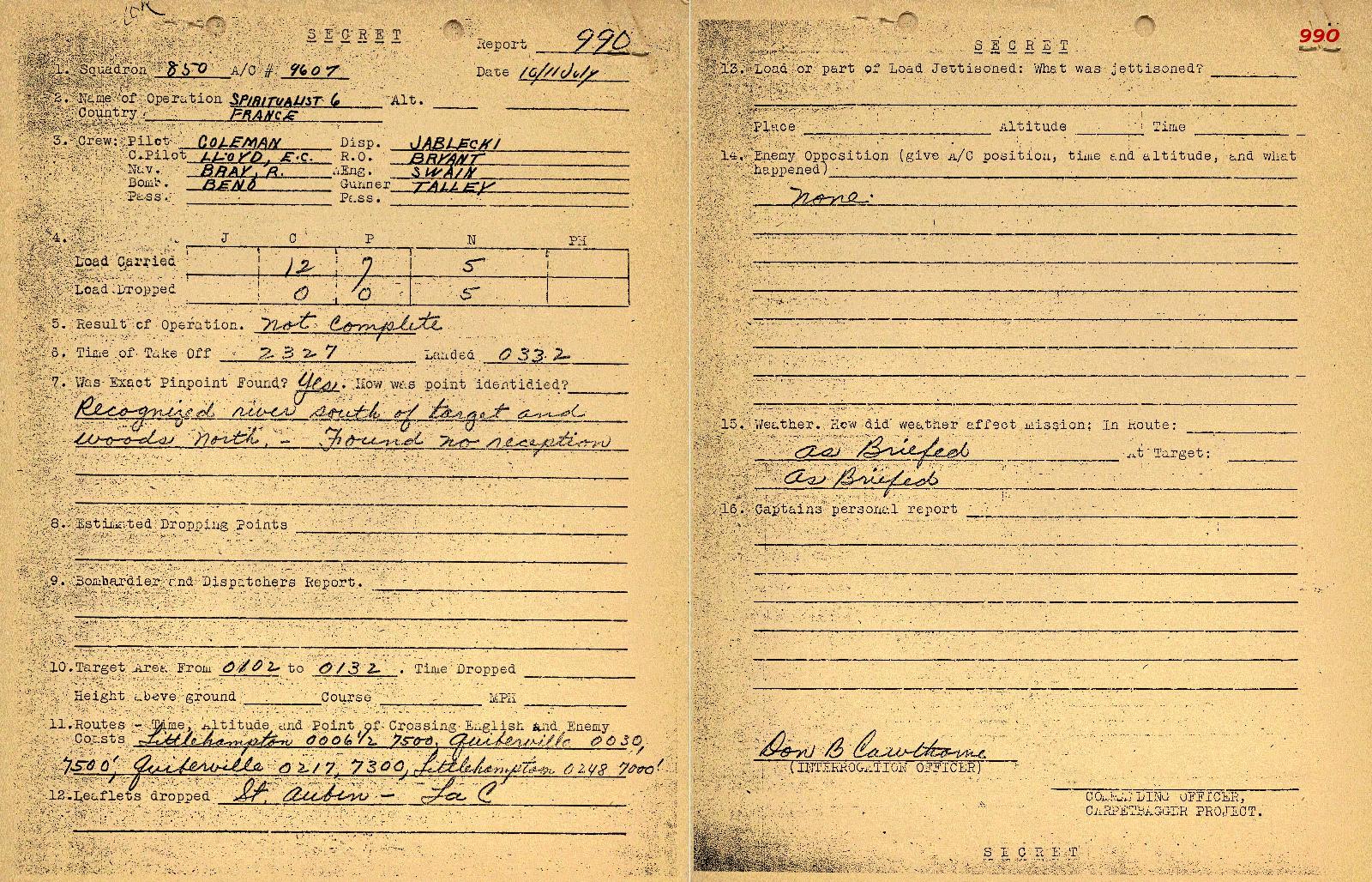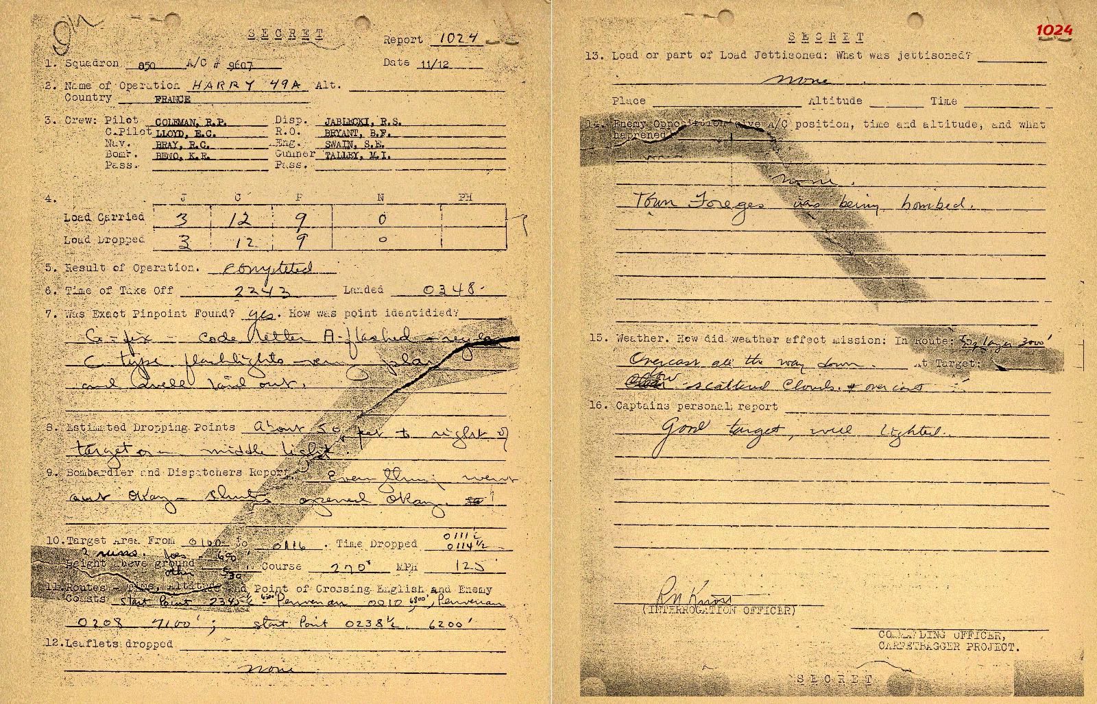 The Coleman crew are pictured above as an 8-man crew at Harrington in the spring of 1944. Their flyover plane "Baby Bug" B24-H 42-94865 was taken from the crew at Eye, Suffolk, when the 850th moved to Harrington. It served for a short time with the 493rd BG and when it became unsuitable for high altitude bombing, was refurbished as a Carpetbagger plane and came to Harrington in July of 1944, where it was recognised and renamed "Baby Bug II".
